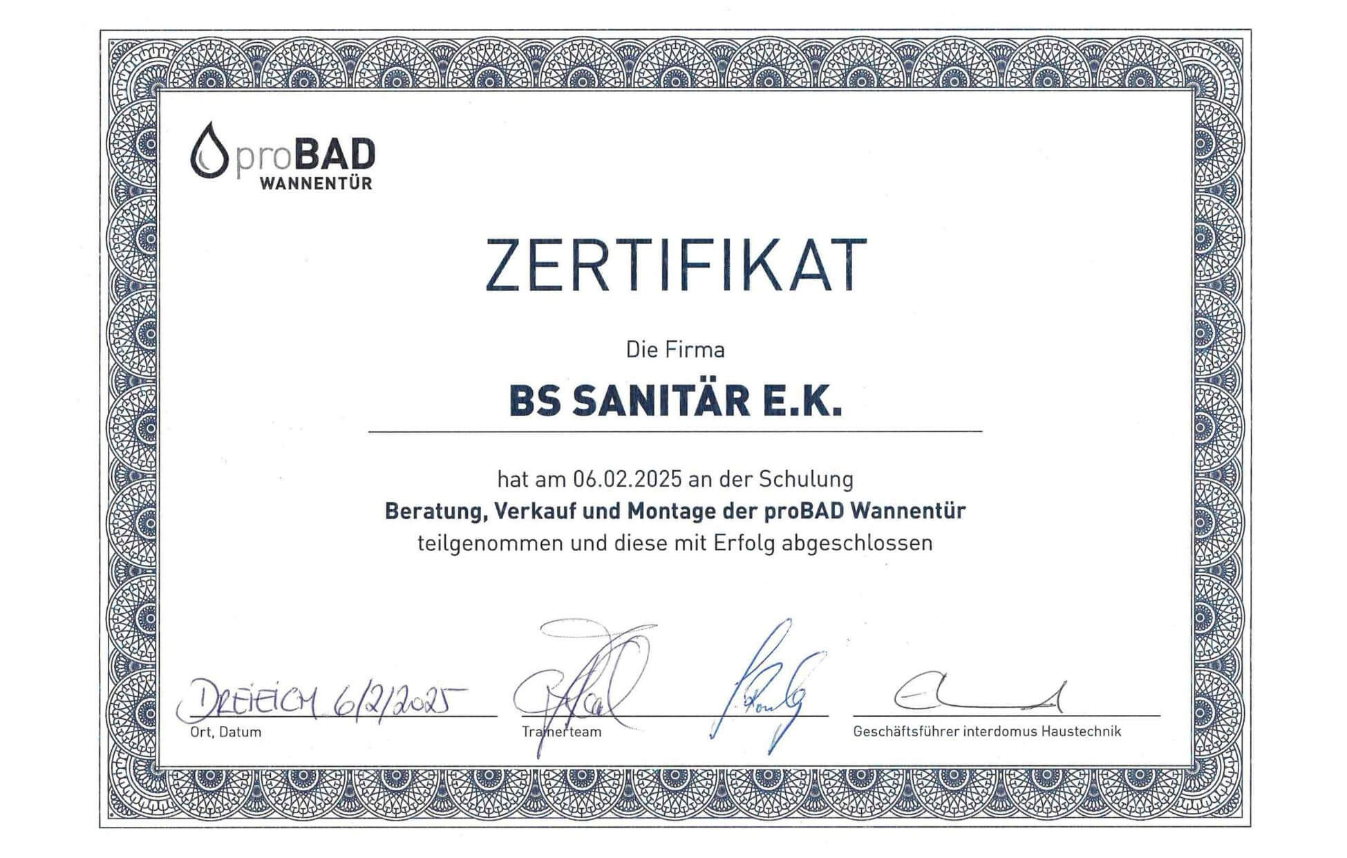 Unsere Firma BS Sanitär E.K. hat erfolgreich an der Schulung für Beratung, Verkauf und Montage der proBAD Wannentür teilgenommen.